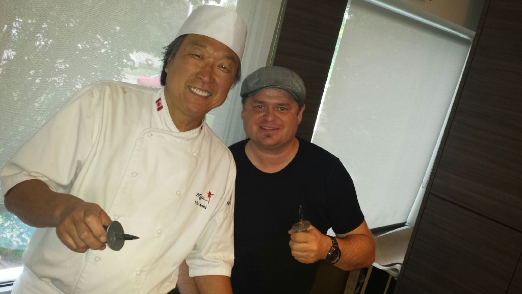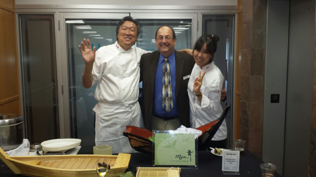 Kerr Village BIA Executive Director, Doug Sams, with chefs from Mye Japanese Restaurant.
